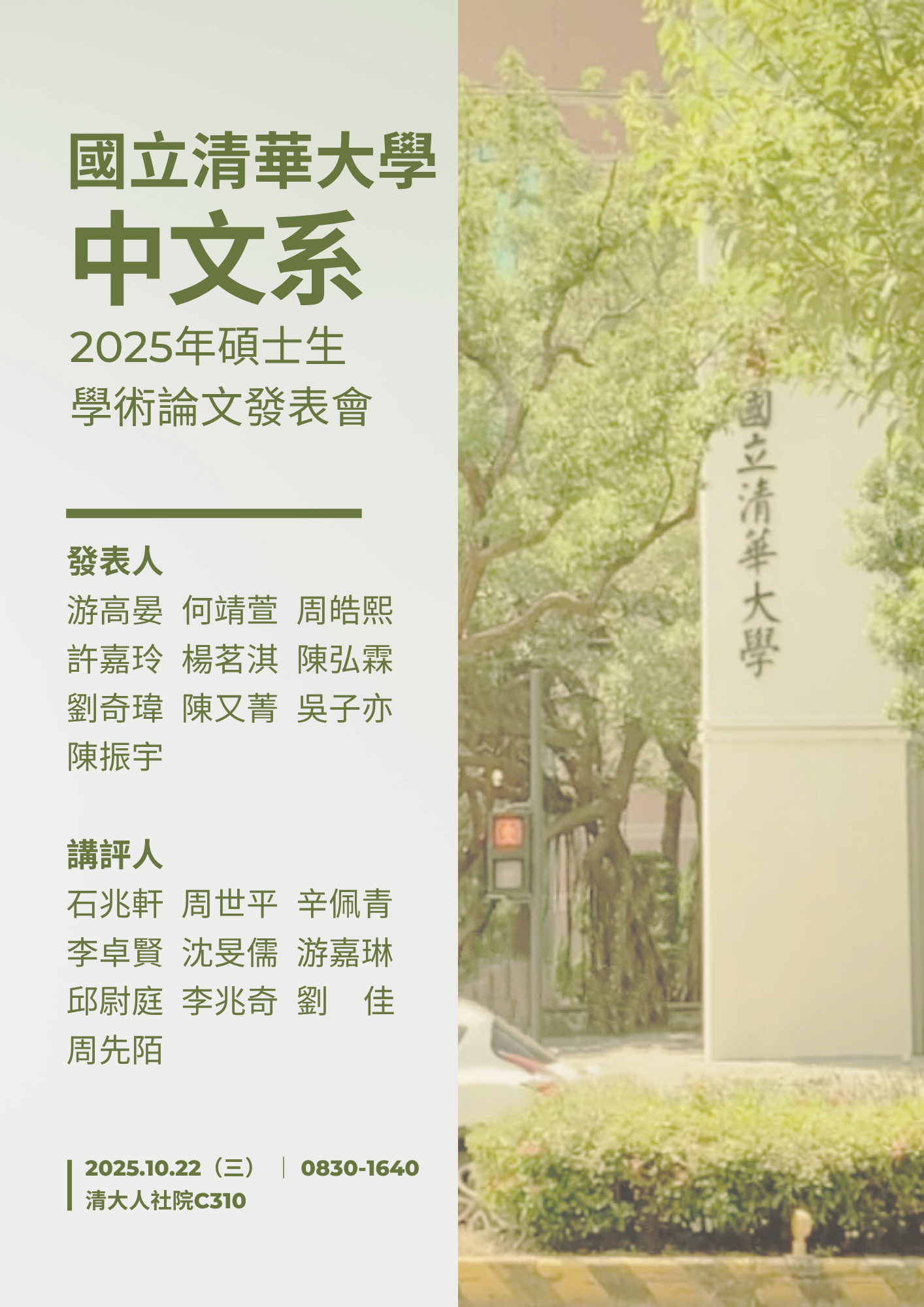 【學術活動】114/10/22(三)2025清大中文碩士生學術論文發表會