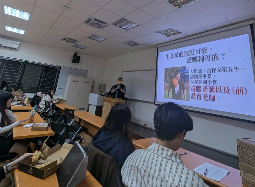 此次邀請大坦誠老師來擔任我們的演講者,同時為國小教師以及自媒體創作者的他,分享了他在求學時期遇到的困難、面對人生的十字路口時如何應對,在短短兩個小時內,分享了自己所遭遇到的種種危機,提供了許多不一樣的思維給我們參考,老師以幽默詼諧的口吻帶來一場精彩的演講,老師還自己印製了手繪明信片當作禮物送給同學們。活動的最後,同學們也都上前和老師單獨合照,許多同學也把握機會和老師聊聊自己從什麼時候就有在關注老師的作品,非常感謝老師來演講。