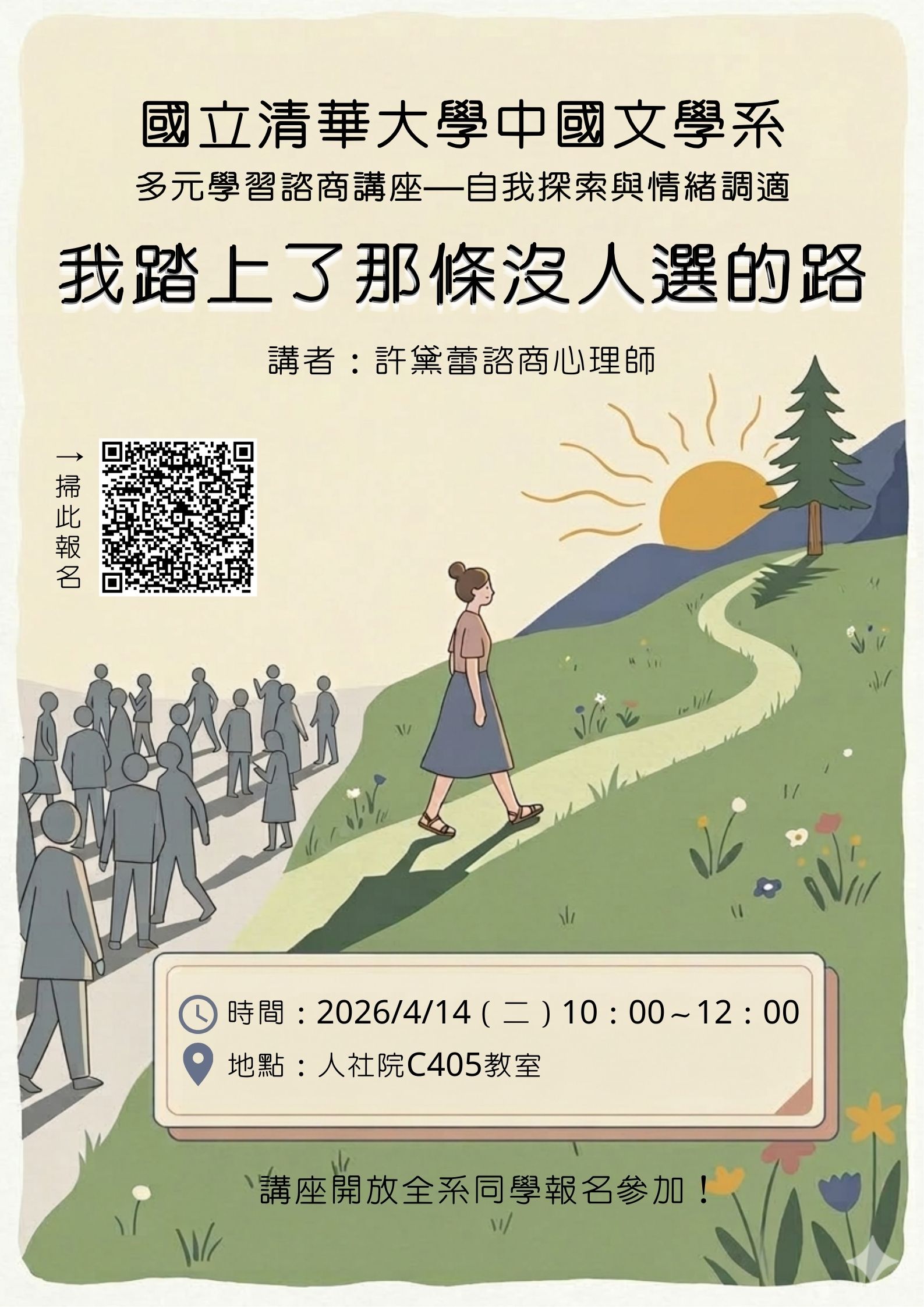 【演講公告】115/4/14(二)中文系「多元學習諮商講座」自我探索與情緒調適—許黛蕾:我踏上了那條沒人選的路